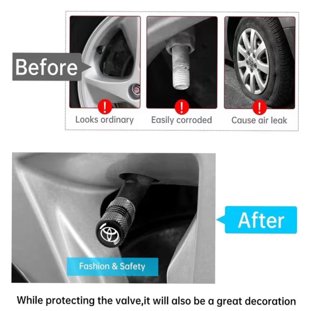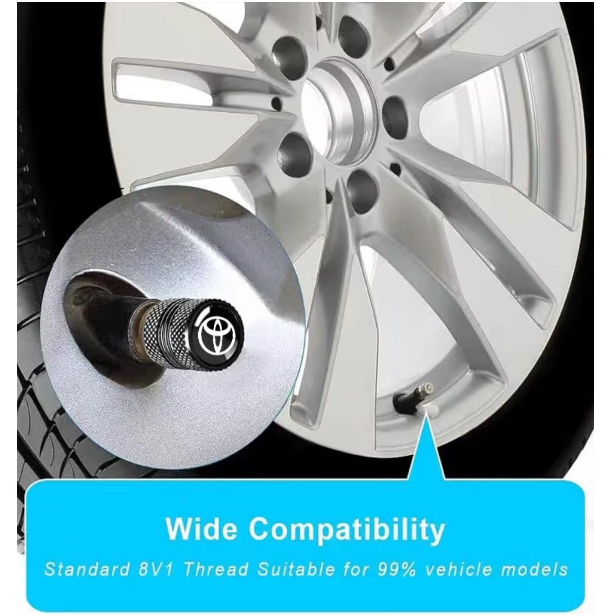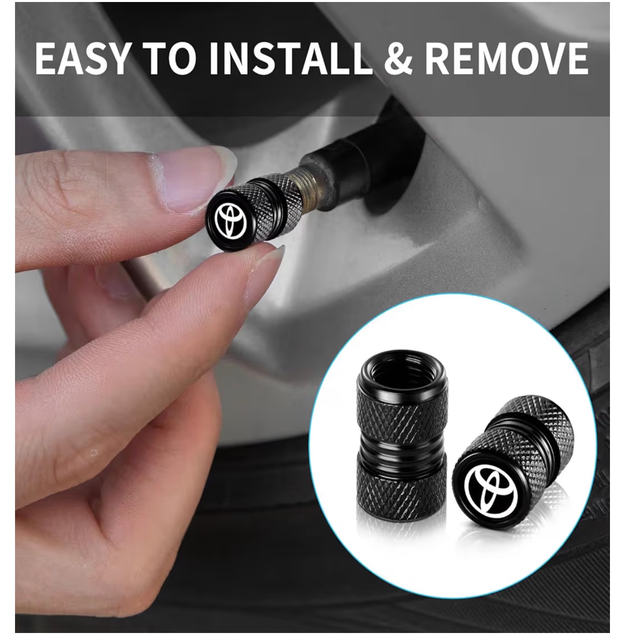 Upgrade your vehicle's style and functionality with these premium Tire Valve Stem Caps, designed specifically for Toyota models including Corolla, RAV4, and Highlander. Crafted from durable metal with a sleek black finish, these caps protect your valve stems from dirt, dust, and damage while adding a sophisticated touch to your wheels. Perfect for enhancing your car's look and ensuring long-lasting tire performance, these accessories are a must-have for any Toyota owner seeking quality and elegance.